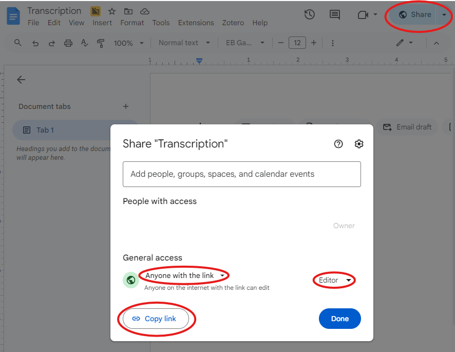 • Set permissions to “Anyone with a link” and “Editor”