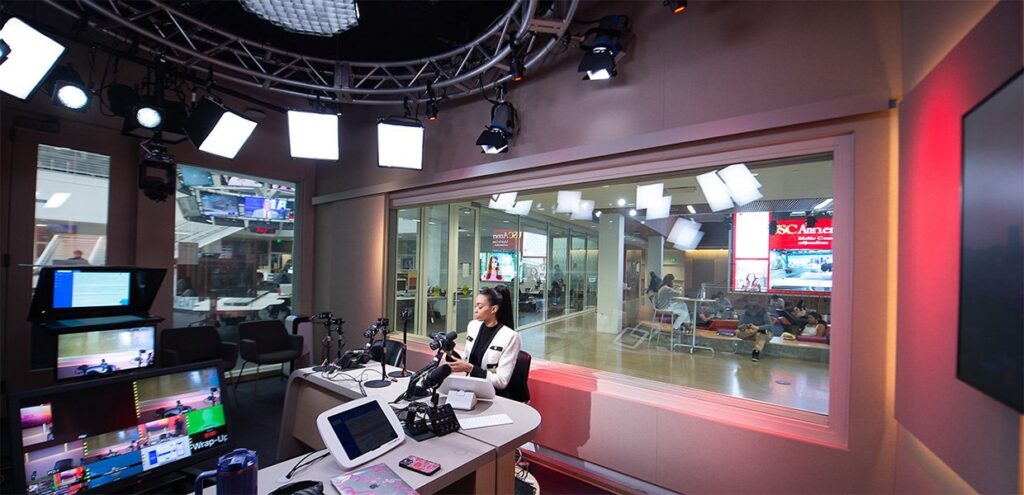 A versatile DIY studio designed to be the future of digital production, the Creator Pod (formerly known as Studio A) allows students to practice getting comfortable on camera and using a teleprompter, and produce their own work through open studio bookings. That can include on-camera in-person or remote interviews, live or streamed programs and the use of graphics — all without needing a crew or control room. The pod also serves as the classroom for a number of USC Annenberg classes.